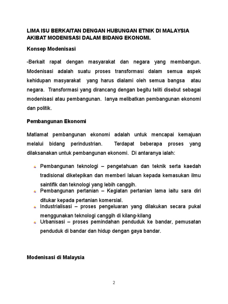 Lima Isu Berkaitan Dengan Hubungan Etnik Di Malaysia Akibat Modenisasi Dalam Bidang Ekonomi Konsep Modenisasi