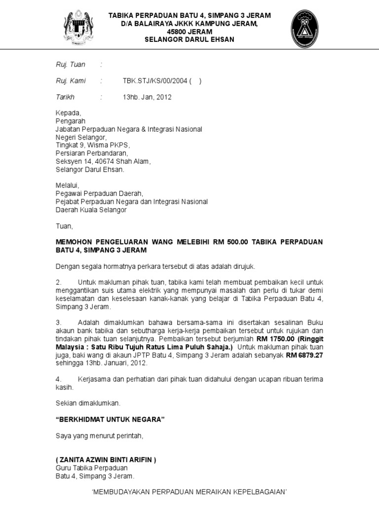 Surat Permohonan Pengeluaran Wang Kpd Pngarah Pembaikan Kelas Tp Bt 4