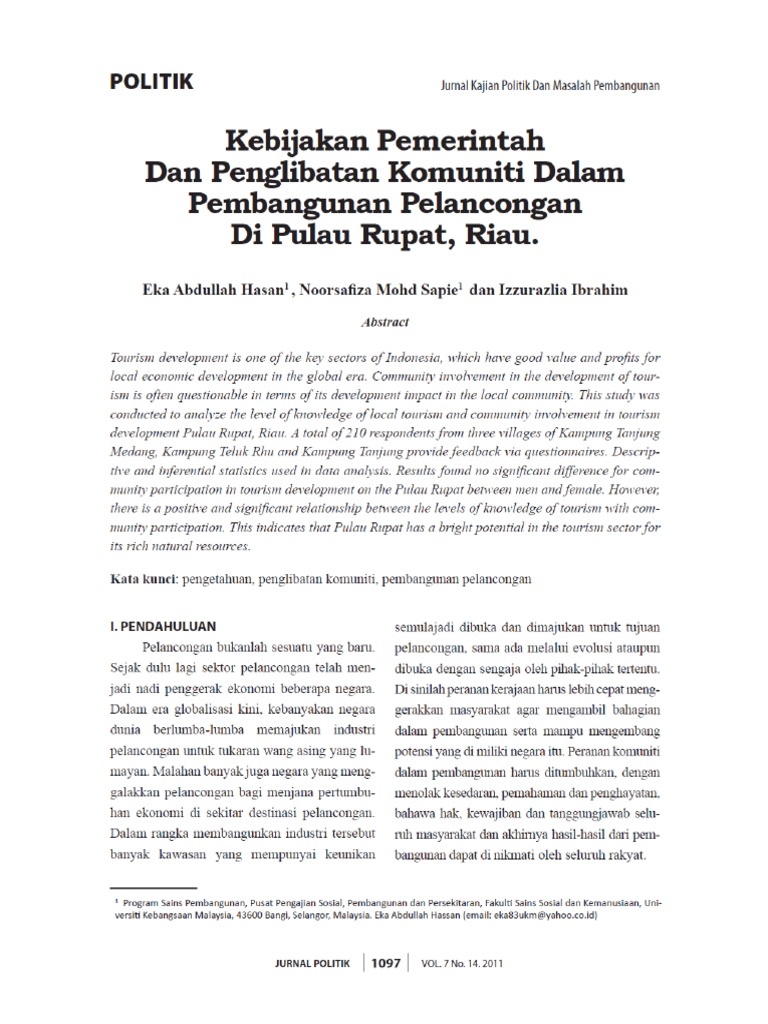 Kebijakan Pemerintah Dan Penglibatan Komuniti Dalam Pembangunan Pelancongan Di Pulau Rupat Riau
