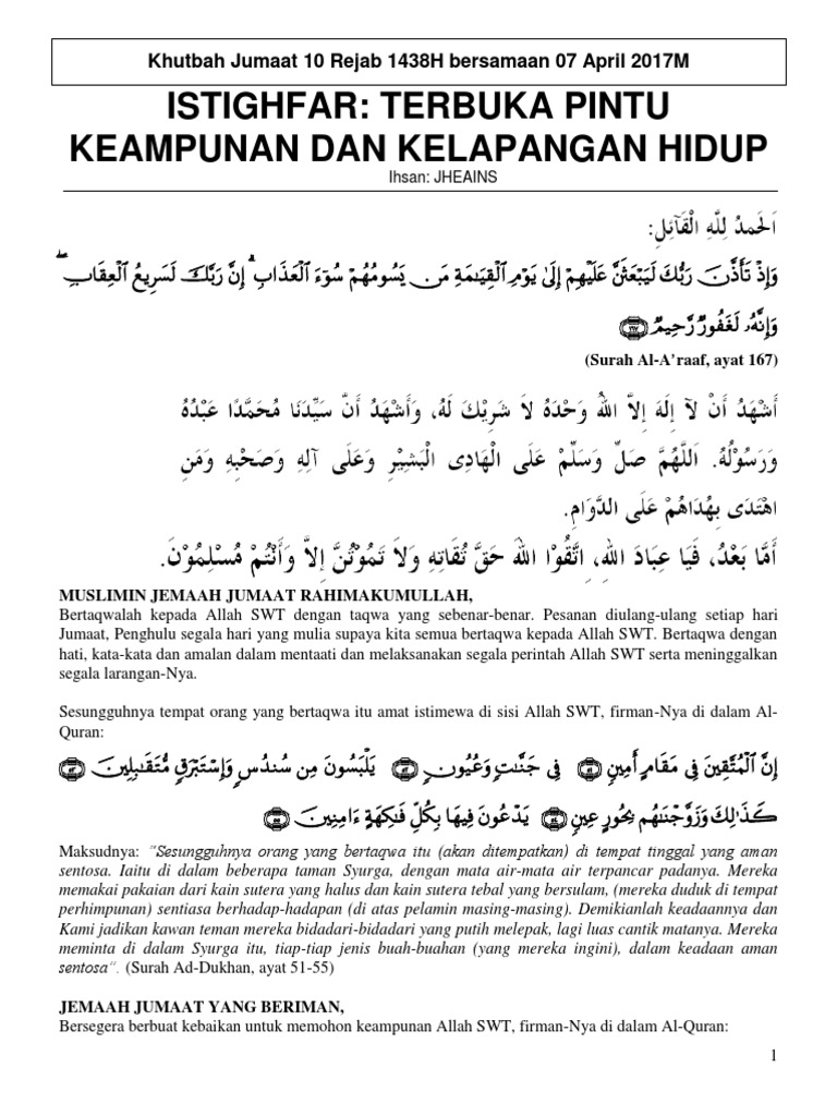 Istighfar Terbuka Pintu Keampunan Dan Kelapangan Hidup Khutbah Jumaat 10 Rejab 1438h Bersamaan 07 April 2017m